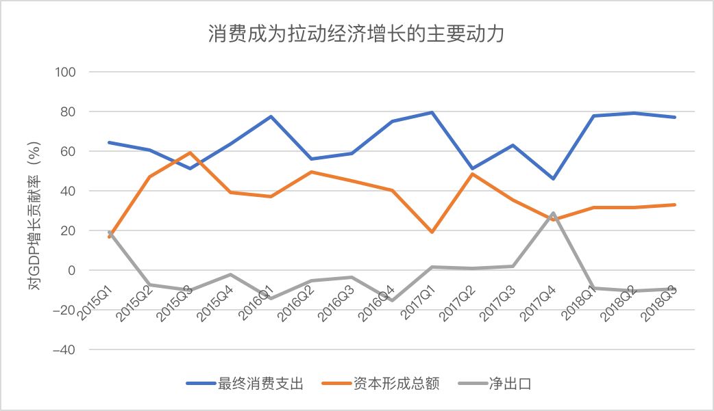 长期来看,随着宏观经济增速下滑,消费增速下降是必然趋势,但总量仍处于上升态势。而且在三驾马车中,消费已经取代投资成为拉动经济增长的主要动力。2018年三季度,最终消费对GDP增长的贡献率高达76.9%,比去年同期大幅上涨14个百分点。
