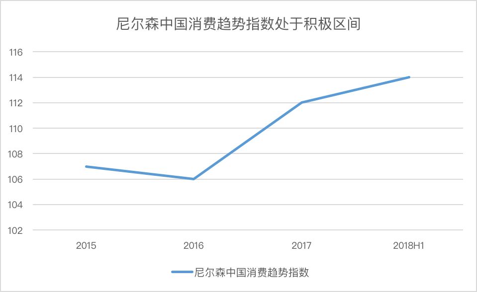 尼尔森数据显示,近年来尼尔森中国消费趋势指数一直处于积极区间,并保持稳健增长。2018年上半年达到114,遥遥领先于全球平均水平95。(尼尔森消费趋势指数衡量消费者对于就业前景、个人财政以及消费意愿三个方面,高于100则为积极,反之则为消极。)