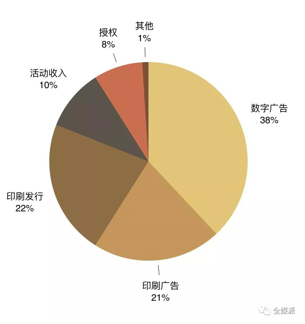 福布斯传媒官方数据显示,2014年间数字广告占其盈利的38%,印刷广告占21%,印刷发行占22%,活动收入占10%,授权占8%。如今福布斯的盈利分布已发生了变化:数字广告占49%,活动收入占23%,授权占10%。相比之下,印刷发行和广告分别占11%和7%。
