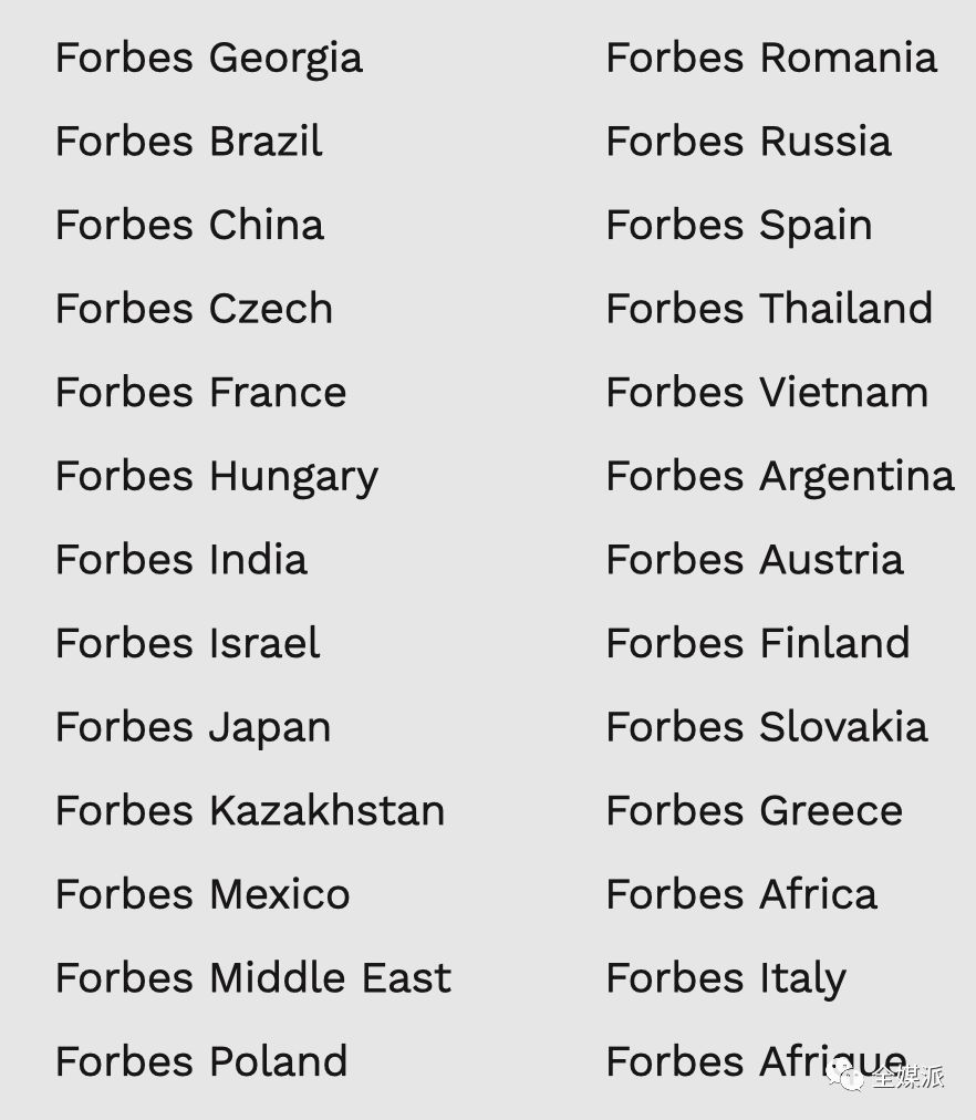 福布斯传媒在全球有40家授权机构,其中包括《福布斯》中国版、《福布斯》印度版和《福布斯》俄罗斯版等。授权机构有与美国阿什福德大学(Ashford University)合作开设的MBA项目——福布斯商学院和福布斯在线技能培训平台。