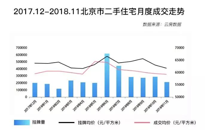 一线城市里,北京二手房的成交均价,在2018年5月达到最高点后就开始持续走低,截止2018年11月均价已跌破6万/平。挂牌量6月后也是一路下滑,11月环比下降接近24%。