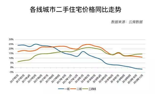 和新房市场相比,二手房市场面临的形势更为严峻。云房数据中心百城二手房价格监测结果显示,各级城市的二手房价在2018年都走出了一条“下滑曲线”,其中,一线城市二手房价格的波动尤为明显,可谓“跌跌不休”。
