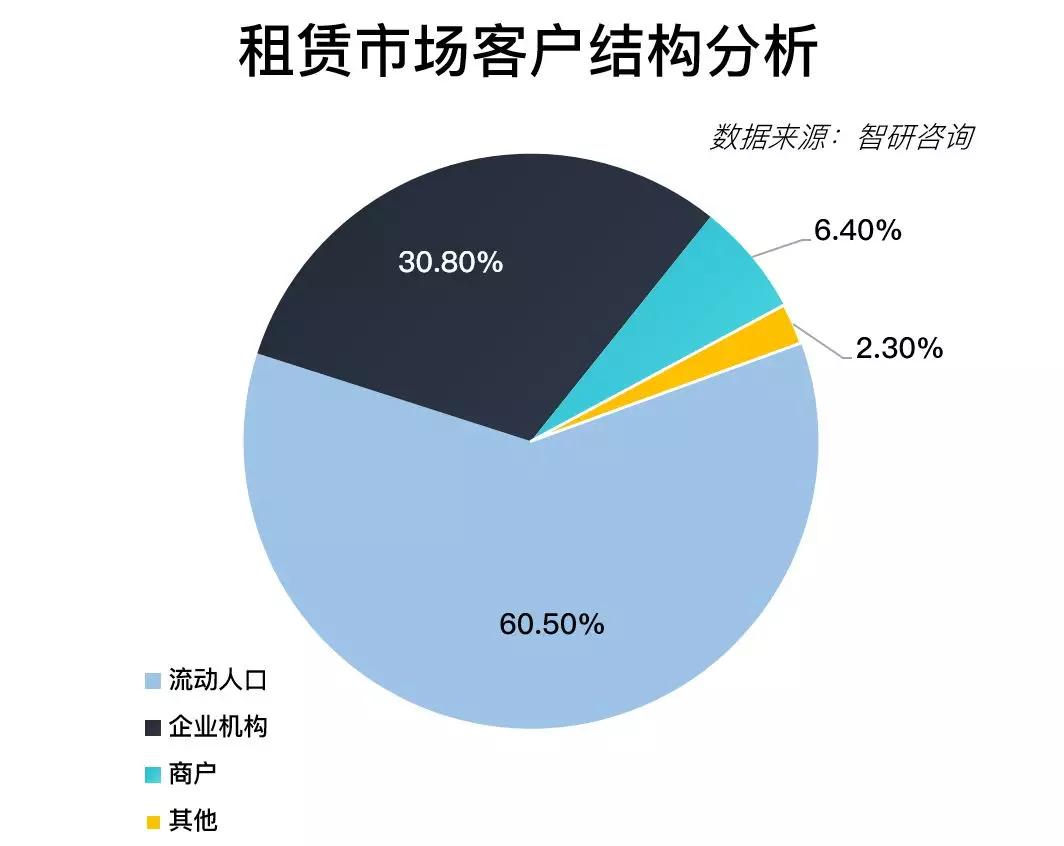 从客户结构来看,流动人口撑起了租赁市场的大半边天,来源占比超60%;企业机构是第二大来源,占比30.8%。