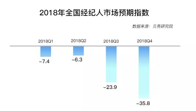 经纪人做为联结卖方和买方的中间人,对市场和行情的感知更为敏感。贝壳研究院全国职业经纪人预期调研的结果显示,2018年经纪人对市场的预期持续走低,第四季度更是降到了-35.8的冰点,悲观情绪蔓延。