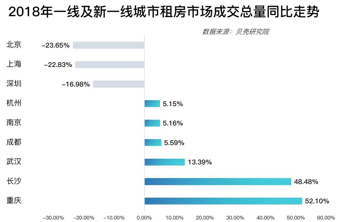 与之相反,“抢人大战”的赢家新一线城市,迎来了一波租赁需求增长。数据显示,以成都、杭州为代表的新一线城市,2018年租房市场成交总量较2017年同期均出现显著增长,其中长沙、重庆的增长甚至高达50%左右。