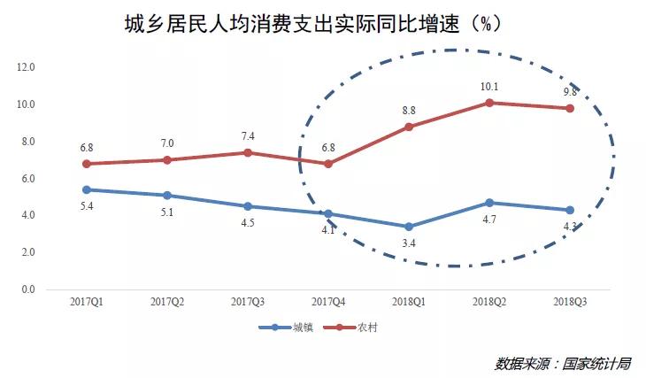 虽然低线人群的收入绝对值不高,但增长速度却足以让人眼前一亮。官方数据显示,剔除价格因素,农村居民近两年的人均可支配收入增速均高于城镇居民。受此影响,农村居民消费支出增速也高于城镇居民,而且城乡居民消费增速的“剪刀差”已经呈现出来。值得一提的是,较低的房价让下沉市场居民很少会为巨额房贷而担忧,因而他们往往拥有更为旺盛的消费意愿,甚至不输头部人群。