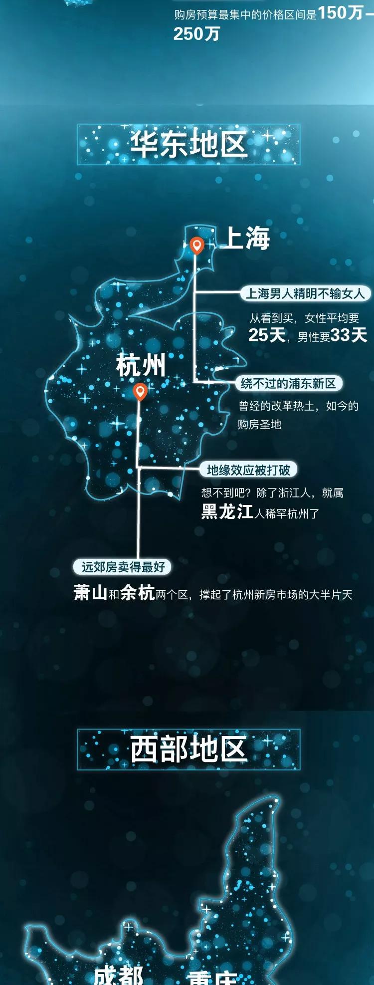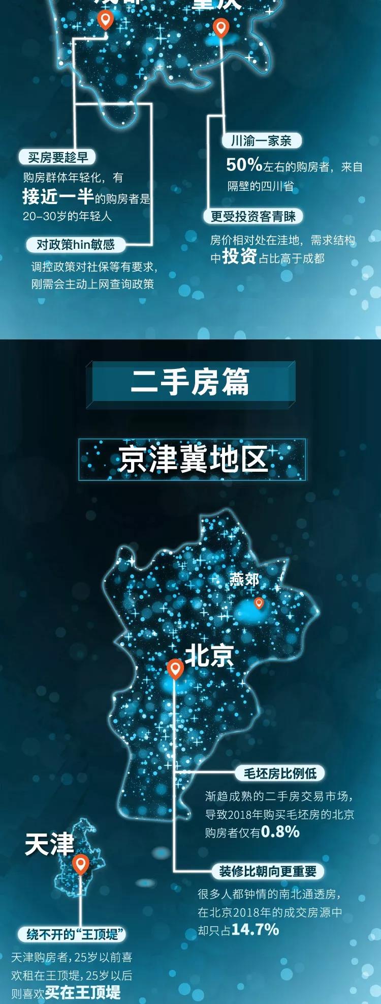 以新房交易为例,北方人最爱去的城市是大家意料之中的北京,杭州购房客中除了浙江人最多的竟然是黑龙江人。重庆和成都虽然是一壁之隔,楼市的情况却截然不同:成都的购房群体偏年轻化,将近一半购房客都是二三十岁的年轻人;重庆因为房价相对处在洼地,2018年投资的需求要明显高于隔壁的成都。