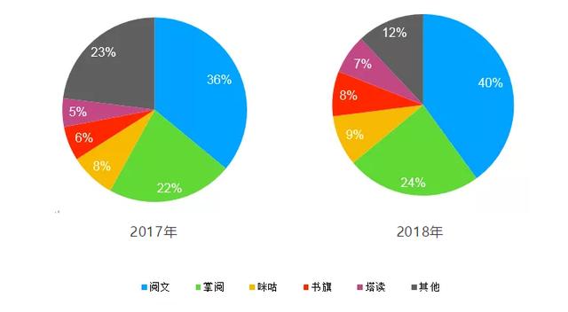 另一方面,独占率在逐年下降,2017年同比下降6.6%达到56.8%,而2018年使用一个阅读app的用户可能突破50%以下,各平台对于现有用户的争夺愈演愈烈。