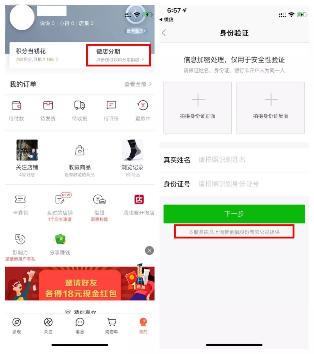 1月2日,微店APP最新改版,“微店分期”被更突出展示,挂在了“我的”界面首栏,点击可获取分期额度。新流财经尝试点击后发现,微店的分期服务由马上消费金融有限公司提供。