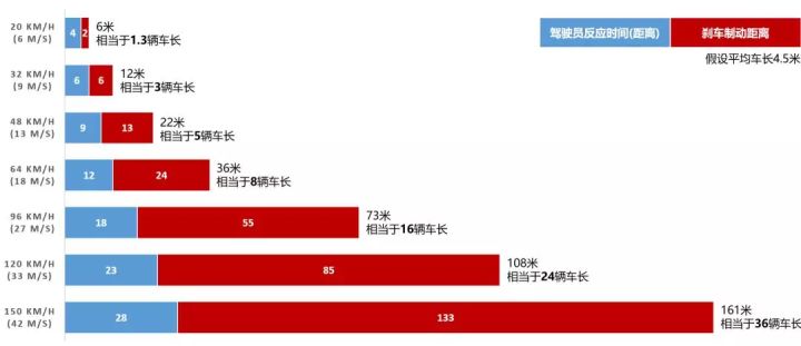 ▲点击看大图 不同时速下的紧急制动距离(基于英国交通部的数据整理)