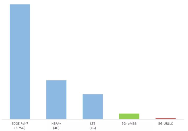 综合采取前述各种方案,5G网络在处理Latency Critical Data时,有望将时延降到1毫秒(1/1000秒)的水平。我们将5G的目标时延与现有网络进行比较,能够更明显的看到这种变化。