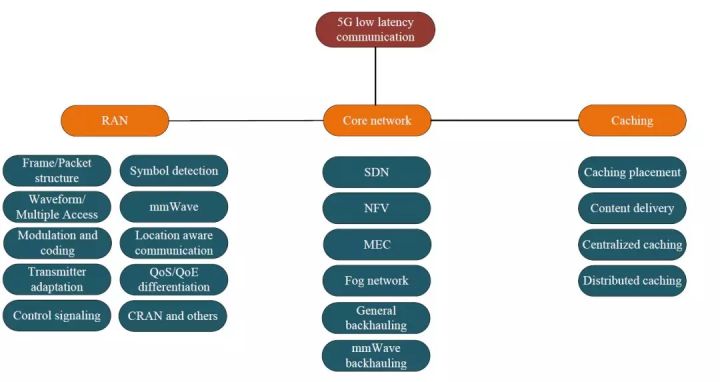 针对车联网、自动驾驶、和VR等场景中的超低时延需求,工程师们设计出了多种优化方案。比如,从帧结构入手,可以降低最小时隙/TTI、放大子载波间隔;此外,极化码、按照时延要求差异对数据进行分层(Priority to latency critical data)等等……此处略去10000字……从无线传输、核心网、缓存效率、分布式网络等不同角度,提出了数十种方案以降低5G网络的总体时延。对目前可得的近300篇文献/方案进行分类,可得到下面的优化思路汇总: