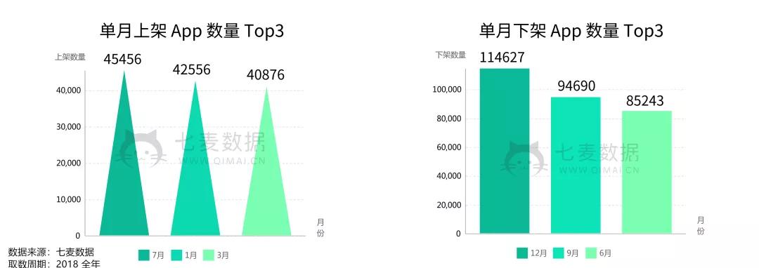 其中,单月上架数最多的发生在 7 月,单月上架 45456 款 App;单月下架数最多的是 12 月,达到了惊人的 114627 款!这都要“归功于”12 月 23 日的“圣诞下架事件”,单日下架数高达 4W+,这也是 2018 年单日下架数量之最!