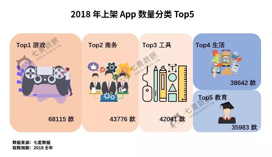 在 2018 年上架的 App 中,游戏类 App 上架数量最多,全年共上架 68115 款,其次是商务类 App 以及工具类 App。