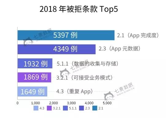 在 2018 年 App 被拒条款统计中,2.1(App 完成度)以 5397 例位居第一;2.3(元数据)排行第二;5.1.1(数据收集和存储)、3.2.1(可接受业务模式)、4.3(重复 App)分列 3-5 位。