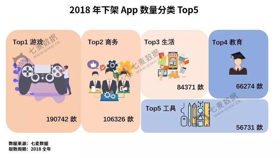 而在 2018 年下架的 App 分类中,“游戏”依旧以 190742 款下架 App 高居第一,值得一提的,上架 App 分类 Top5 与下架分类 Top5基本一致。(仅排名顺序略有不同)