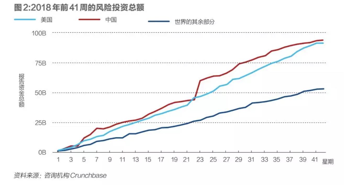 根据咨询机构Crunchbase发布的数据,在2018年过去的41周(近10个月)以来,中国风险投资的总额已经达到创纪录的938亿美元,领跑全球;而美国排名第二,总规模为916亿美元,比中国低了22亿美元;此外,世界其他地区的风投总额加在一起为534亿美元,差不多仅为同时期中国风投总额的一半。