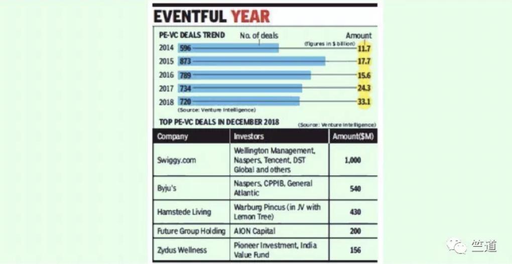 值得一提的是,印度私募股权和风险投资的退出在去年也取得了不错的成绩,2018年创投退出总额比2017年增长了78%,金额达到了254亿美元。