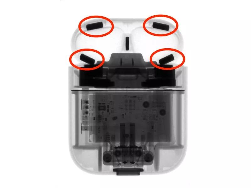 ▲ AirPods 充电盒顶部盖子也藏了四个磁铁。图片来自:iFixit