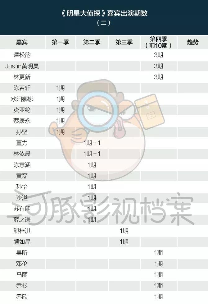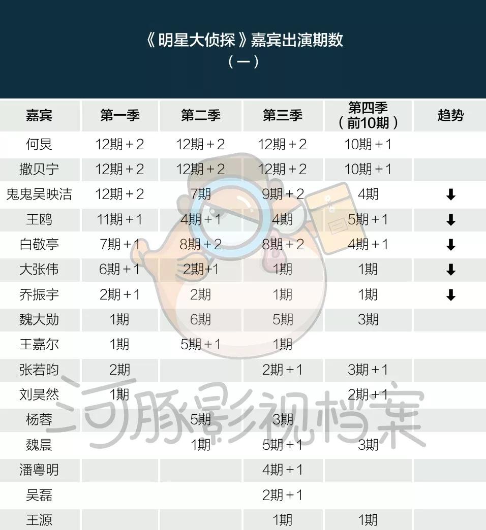 “十二集老玩家都要排不开了,飞行嘉宾请谨慎选择。”第四季开播前,一位老粉丝在@明星大侦探官微 的评论区说道。然而,老玩家的数量真的多到排不开吗?如果将参加过两期及两期以上的艺人都称为老玩家,那么在第四季以前,除何炅撒贝宁外的老玩家共有12位。