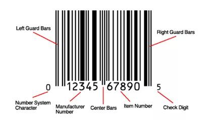 以标准的UPC为例,条形码中包含12位数字。其中,前六位是生产公司的编号,由统一编码委员会分发;后五位是产品本身的编号,由生产公司自行进行编排;而最后一位是验证数字,用来保证产品在结账时不会有差错。