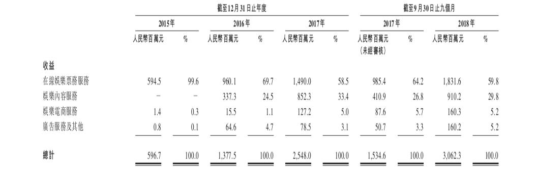 根据其更新后的招股书显示,2018年前三季度,猫眼娱乐实现营业收入30.62亿元,同比增长99.6%,产生亏损净额1.44亿元,同比下降05.26%,去年同期为1.52亿元