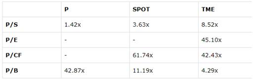 与欧美的流媒体公司相比较,由于潘多拉、Spotify尚未盈利,但腾讯音乐已经取得盈利,虽然净利率达到18%,但公司的市盈率仍超过45倍;其他方面,公司的市销率为8.52倍,高于潘多拉的1.42倍和Spotify的3.63倍,而在市现率和市净率方面公司相对较低。