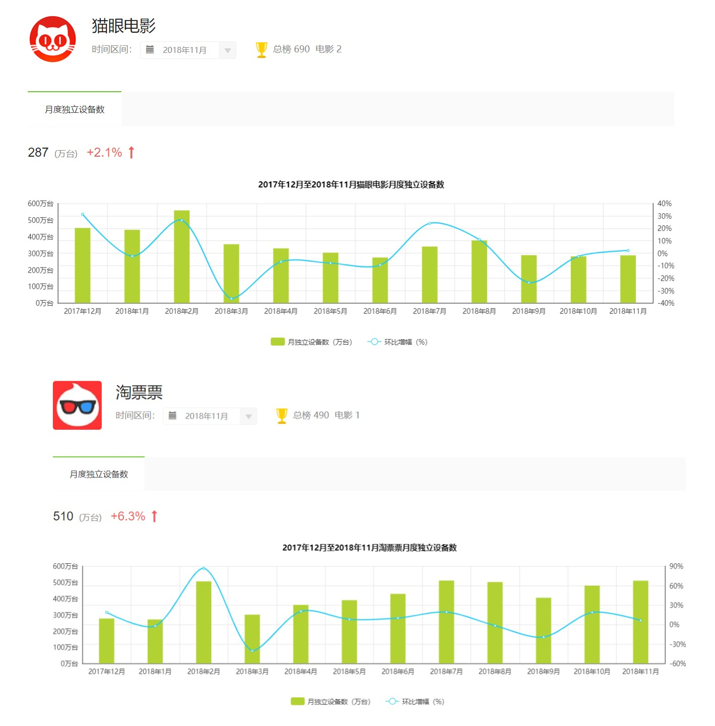 根据艾瑞的最新数据显示,截止2018年11月猫眼电影的月独立设备数为287万台,环比增幅为2.1%。淘票票的月度独立设备数位510万台,环比增幅6.3%。