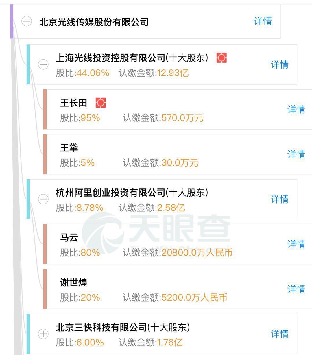 虽然这个合作在2018年5月到期之后就已经结束,双方也未再续约,但根据天眼查的信息显示,目前阿里依然是光线传媒的第二大股东。最大竞争对手的控股公司,是自己大股东的二股东,这样的负责关系或许也令猫眼娱乐暗自腹诽。