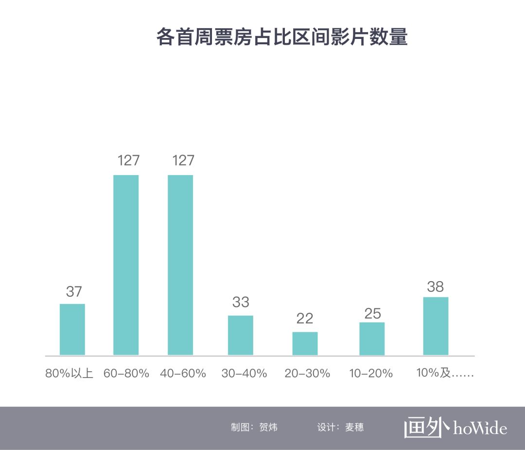 首周票房占比很高的影片通常是小片,因为它们首周后通常就没有场次了。37部首周票房占比超过80%的影片中,只有3部票房过亿,分别为《爱情公寓》《地球最后的夜晚》和《欧洲攻略》。
