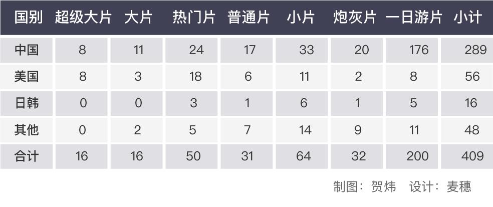 若将但凡有中国参与合拍的影片都算国产片,将美国主导的影片算作美国片,日韩主导的影片算作日韩片,剩下的算其他片。那么,除了289部国产片外,美国片、日韩片和其他片的数量分别为56部,48部和16部。