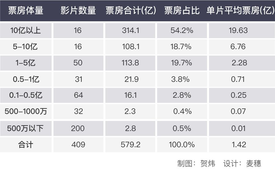 2018年共有1923部影片显示有放映记录,剔除1365部票房不超过10万的影片,27个电影节票房记录,20部无明确上映时间的影片及102部非本年度上映影片后,剩余409部本年度上映的影片共产生票房579.2亿。本文所有的分析基于这409部新片,而非本年度的所有影片。