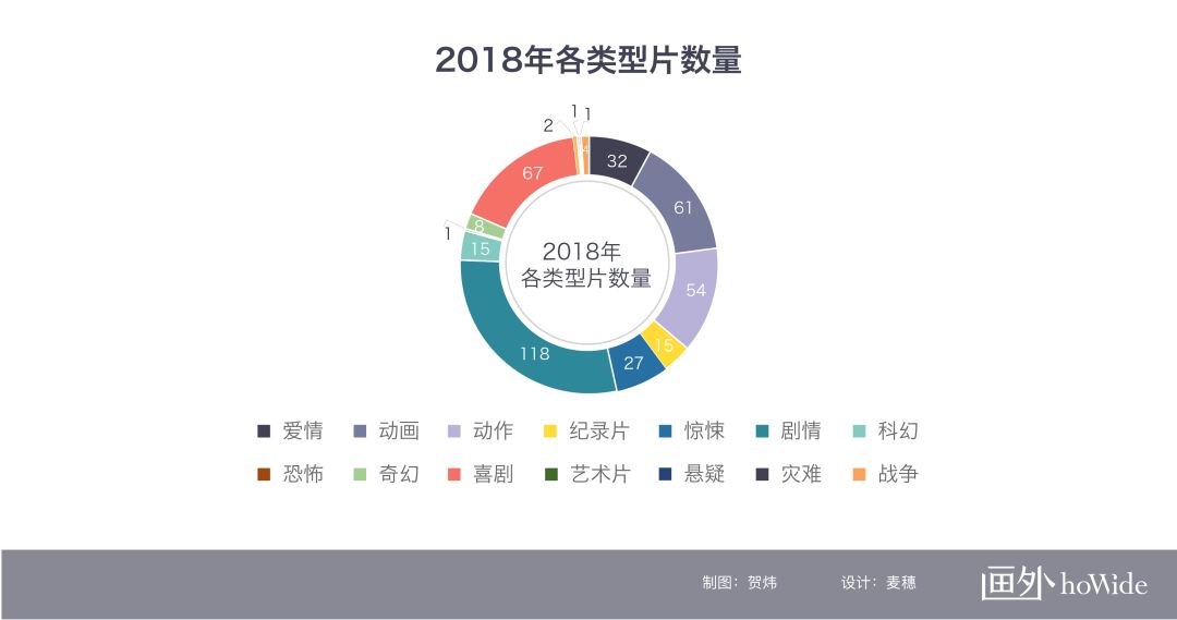 剧情片依然是影片数量最多的一类,达118部,比2017年多出52部,共产生票房85.6亿,平均单片票房仅0.73亿,表现并不算好。