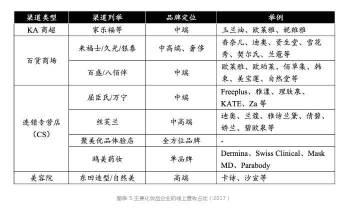 从品牌定位角度分析,扣点和准入门槛较高的百货专柜、提供优质服务内容的大型连锁专营店、高级美容院普遍被中高端品牌垄断;中端品牌的适应范围较广,渗透率较高的渠道包括百货、连锁专营店、大型商超等;而本土大众品牌消费客单价较低,电商和三四线城市CS渠道更有优势。
