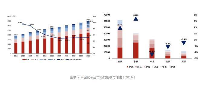 据Euromonitor 的统计数据显示,2016年我国化妆品行业市场规模为3,339亿元,整体市场规模全球第二,超过日本仅次于美国,呈现持续增长态势。更值得关注的是,随着二三线城市化妆品市场消费力逐渐释放,国货化妆品的市场增速明显,行业发展空间巨大。