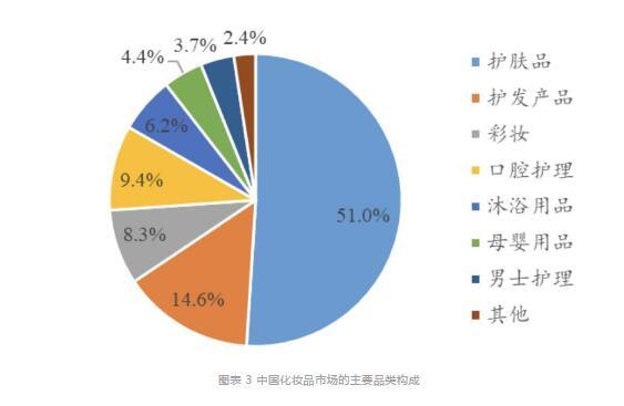 从国内化妆品市场结构来看,护肤品、护发产品、口腔护理产品、沐浴用品和彩妆是前五大品类,合计贡献了90%的市场销售额。其中,护肤、面膜、彩妆是各企业的主要竞争领域,也是增速较快的品类。