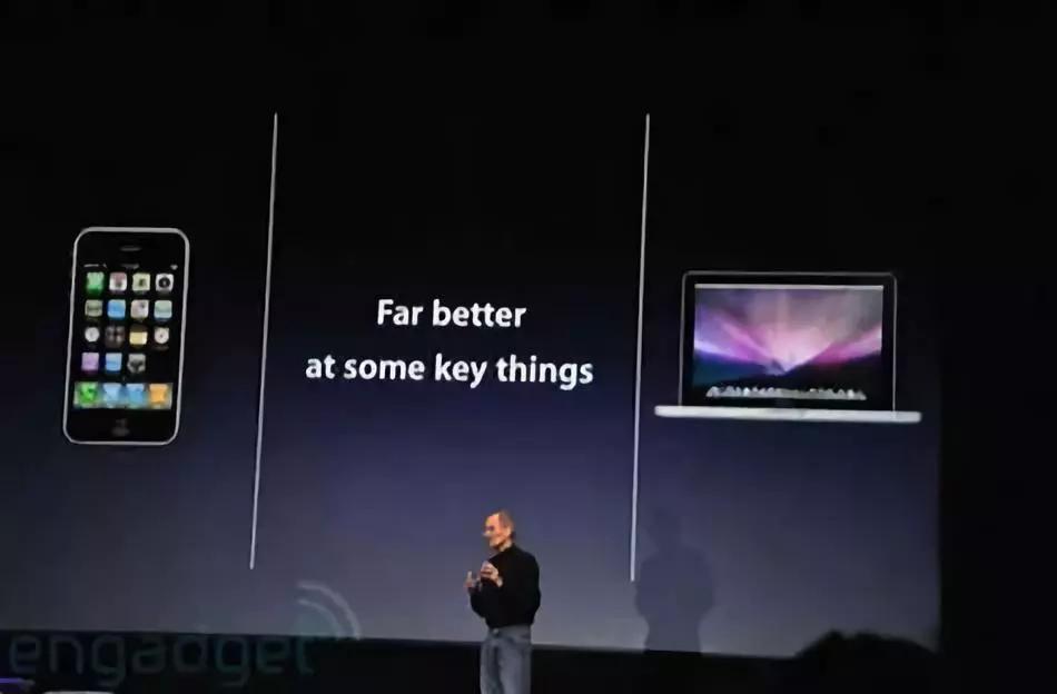 乔布斯在发布会上第一次介绍 iPad 的时候,画了这样一张 PPT,左边是手机(更好的移动性),右边是电脑(更好的计算和显示性能)。