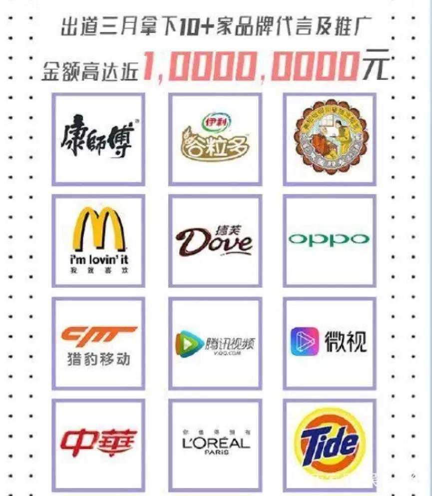 而这一切流量热度具体显现在了少女们出道后的广告代言、专辑销量与活动门票上。从节目到成团的几个月内,火箭少女们(团体或个人)一连拿下了麦当劳、谷粒多、康师傅冰红茶、德芙、微视等12家代言,总金额接近1亿。