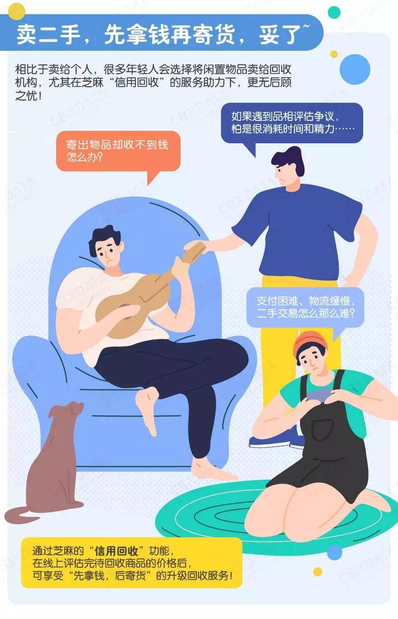 与此同时,相对于卖给个人,年轻人更偏爱更简单快捷的方式——将闲置物品卖给回收机构。比如芝麻分达到一定标准后,通过“信用回收”在线上评估完待回收商品的价格,享受“先拿钱,后寄货”的升级回收服务。