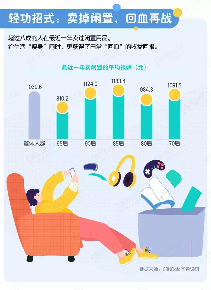成长与物质生活丰富的时代,90后们深谙“断舍离”的生活经营之道,出售闲置物品也更为积极和擅长。CBNData问卷调研显示,90后、85后年轻人从出售闲置中获益最多,最近一年卖闲置的平均报酬超过1100元。