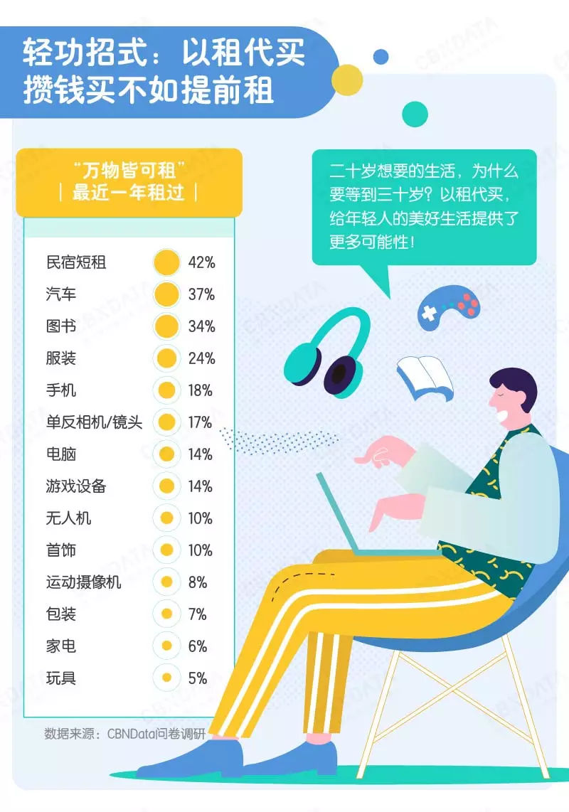 而且除了已经被广为接受的租房租车服务,服装、手机等日常物品类租用也正在受到年轻人的追捧,单反相机镜头和无人机为代表的高价低使用率物品也成为租物香饽饽,这也预示着未来租生活中更多的选择和可能性。