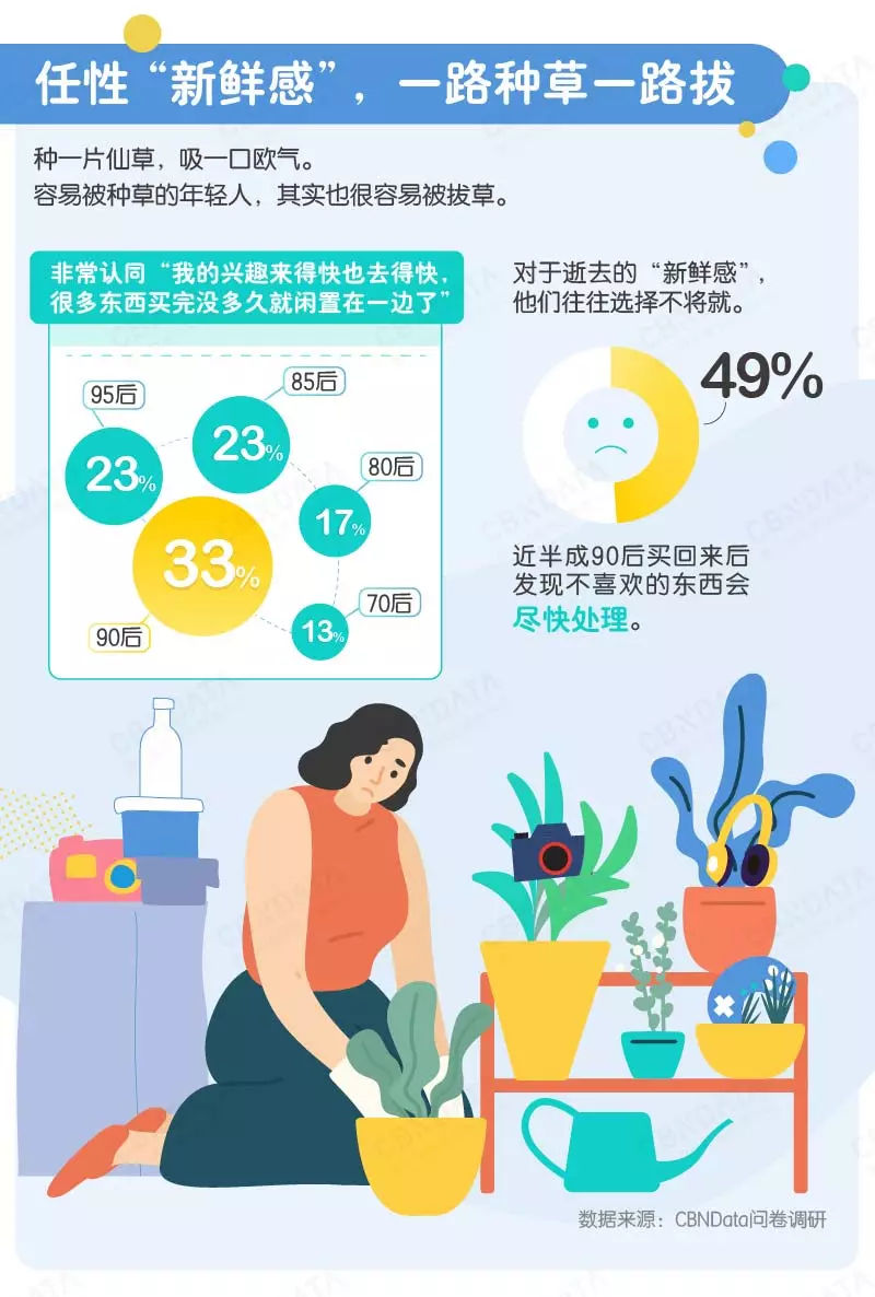 年轻人本就容易产生购买冲动,再加上互联网化平台大幅增加了种草渠道,最终强化了他们渴望尝鲜、迅速种草拔草的消费特点。CBNData问卷调研显示,33%的90后非常认同“我的兴趣来得快去得也快,很多东西买完没多久就闲置了”。《报告》指出,年轻人更认同“喜欢”对购买决策的重要意义,可以说千金难买心头好。但一旦发现不喜欢了,近半数的90后会选择“尽快处理掉”。