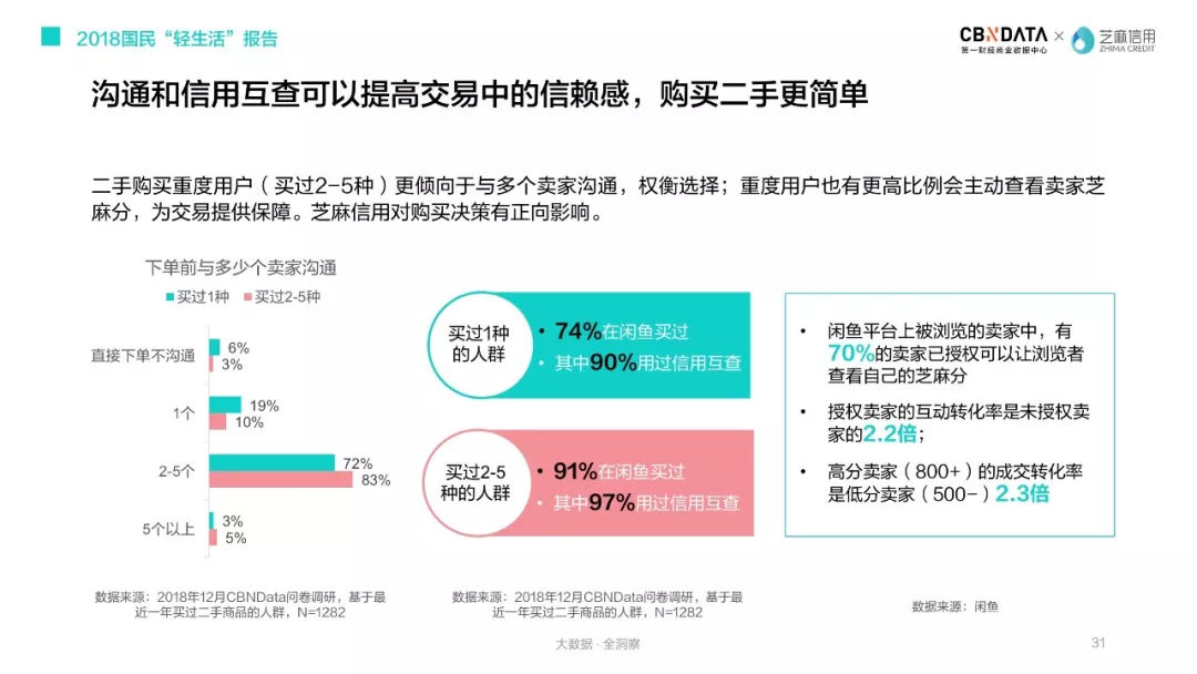 但他们也普遍反映,买二手遇到最大的困扰在于卖家是否可信赖,CBNData《报告》指出,近六成消费者对于二手市场中卖家的可信赖度表示担忧。二手购买重度用户(买过2-5种)更倾向于与多个卖家沟通,权衡选择;重度用户也有更高比例会主动查看卖家芝麻分,为交易提供保障。