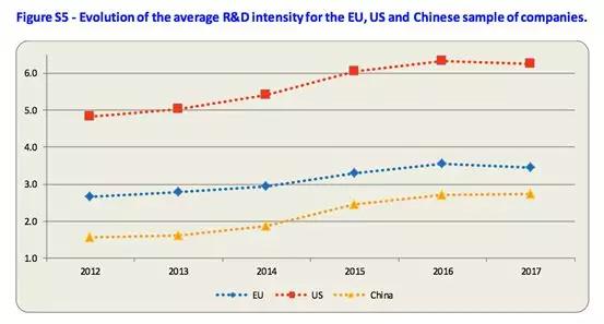 在研发投入强度方面,欧盟仍落后于美国,并受到中国挑战。欧盟与美国和中国公司在过去6年中的研发强度差异的比较表明,两者与美国的差距越来越大,中国的研发整体投入在持续增加,但仍落后于欧美。