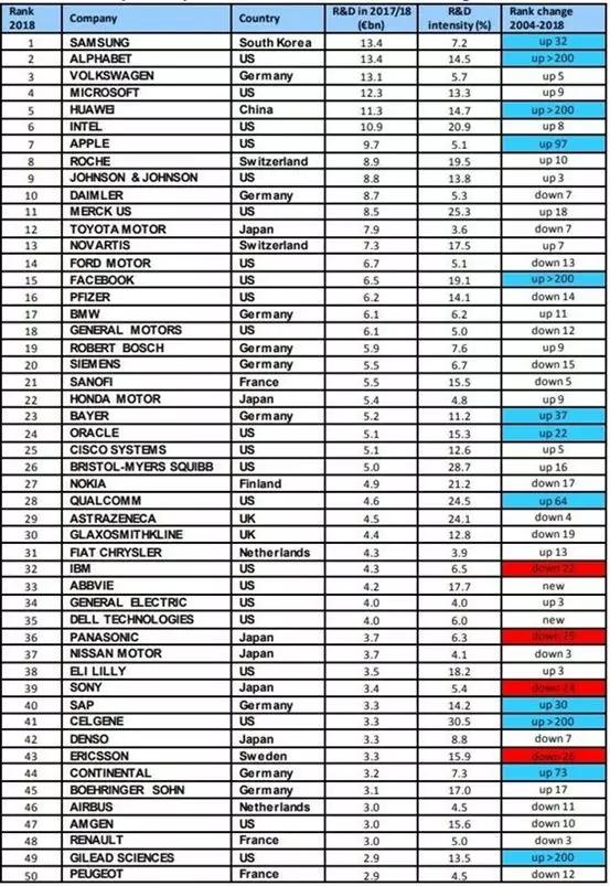 欧盟发布2018全球企业研发费用榜单:华为超苹果跃居第5,BAT排名50开外