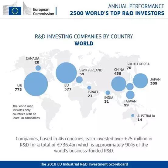 今年全球企业研发投资经费近736.4亿欧元,相较上一年增长了8.3%。其中有438家中国公司,778家美国公司,577家欧盟公司和339家日本公司。
