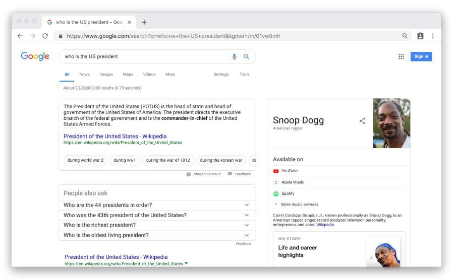 因此,当你搜索“英国的首都在哪里”时,你可能认为会出现伦敦。但实际上,你可以将它修改为任何地方,比如火星。如果你搜索“谁是美国总统?”,你可以直接操纵结果,让它变成“Snoop Dogg”。