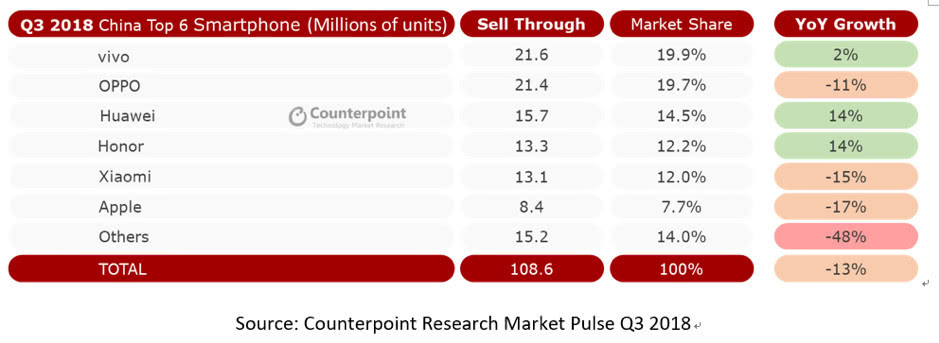 中国手机市场去年四季度的数据目前还尚未公布,但根据Counterpoint公布的三季度数据,在市场份额排名前五的厂商当中,华为、荣耀和vivo都出现了逆势上涨。而由于iPhone XS系列的初期表现不佳,苹果的市场份额下降了17%。