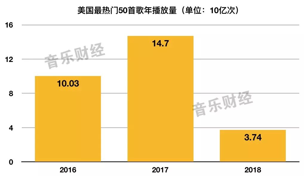 这正是此前没有预料到的,因为2016至2017年这一数字并未有明显变化。(2016年排名前50的曲目的实际播放量为100亿,占比4%。)