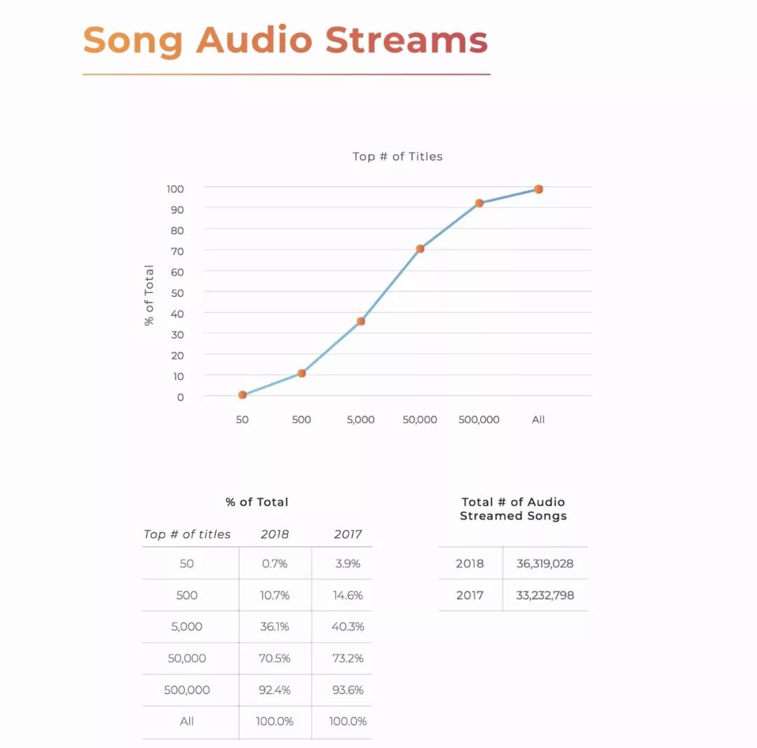有趣的一个数据对比即为:2017年前50万首曲目的播放量是其余音乐的14.6倍。而在2018年这一比例则下滑到了12.2倍。